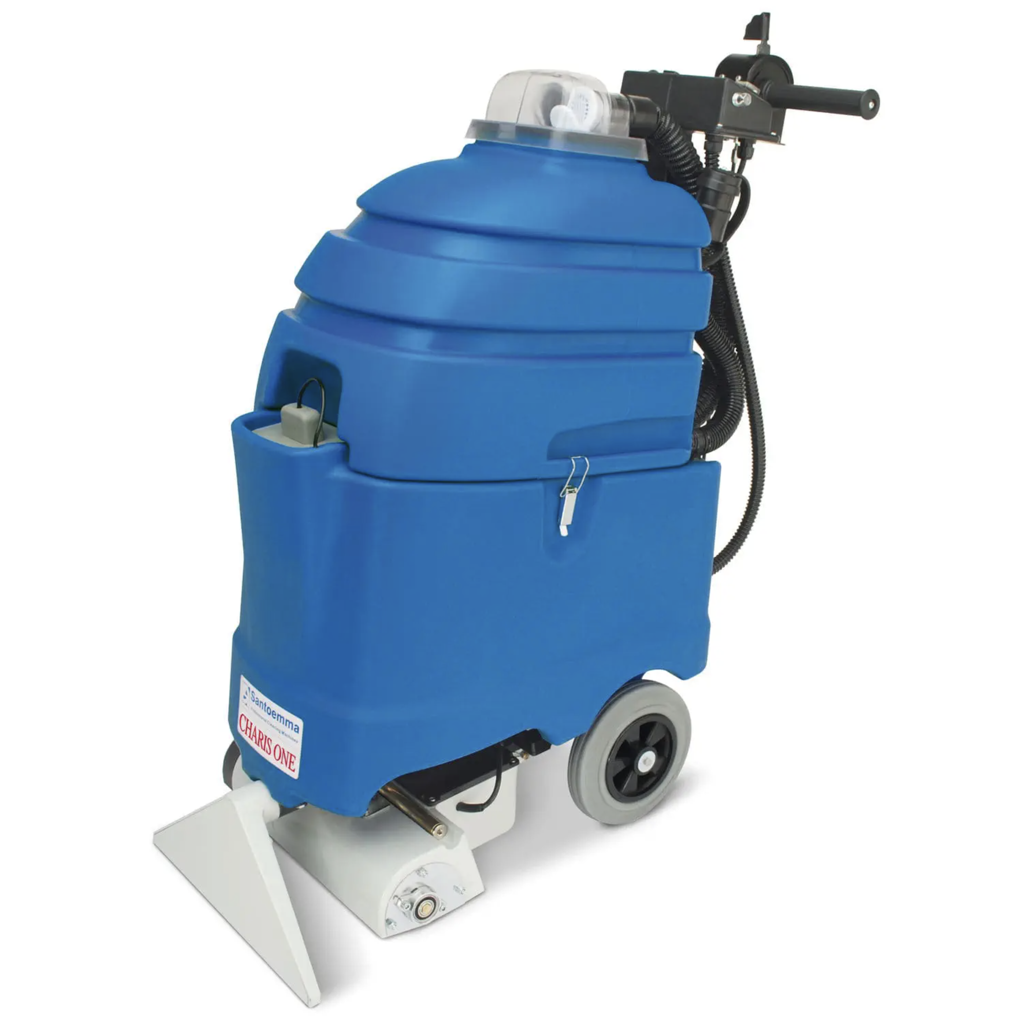Macchina ad iniezione-estrazione compatta, con spazzola rotante, progettata per la pulizia professionale di piccoli ambienti di moquette e di pavimento. Uno speciale dispositivo consente di passare dal funzionamento come lavamoquette a quello come lavapavimenti mediante la semplice rotazione di una leva.