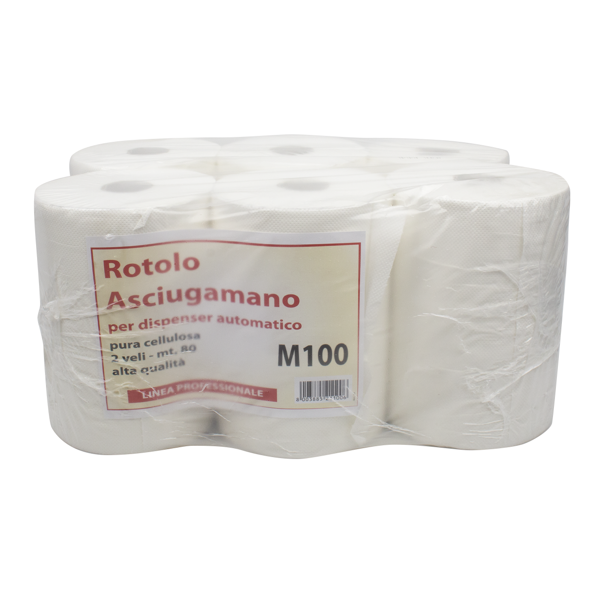 Asciugamano rotolo per dispenser taglio automatico, pura cellulosa, goffrato, lunghezza 100 metri, larghezza 20,5 cm.