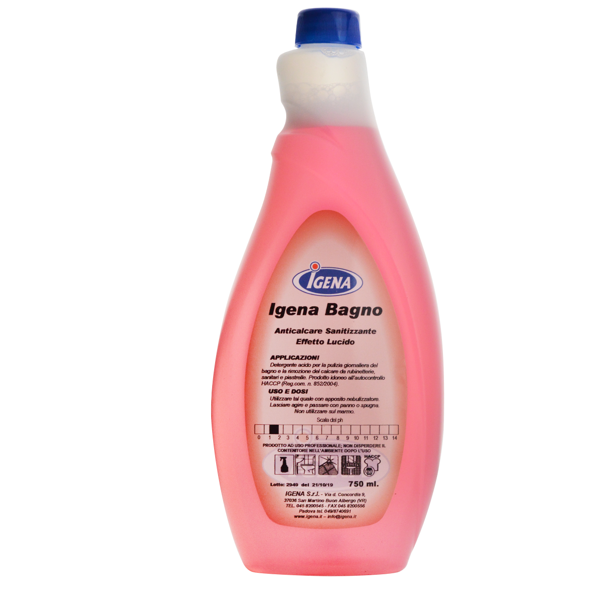 IGENA BAGNO è un detergente a base acida contenente tensioattivi. Appositamente studiato per la pulizia giornaliera del bagno e la rimozione del calcare da rubinetterie, sanitari e piastrelle. Prodotto idoneo all’autocontrollo HACCP (Reg.com. n. 852/2004).