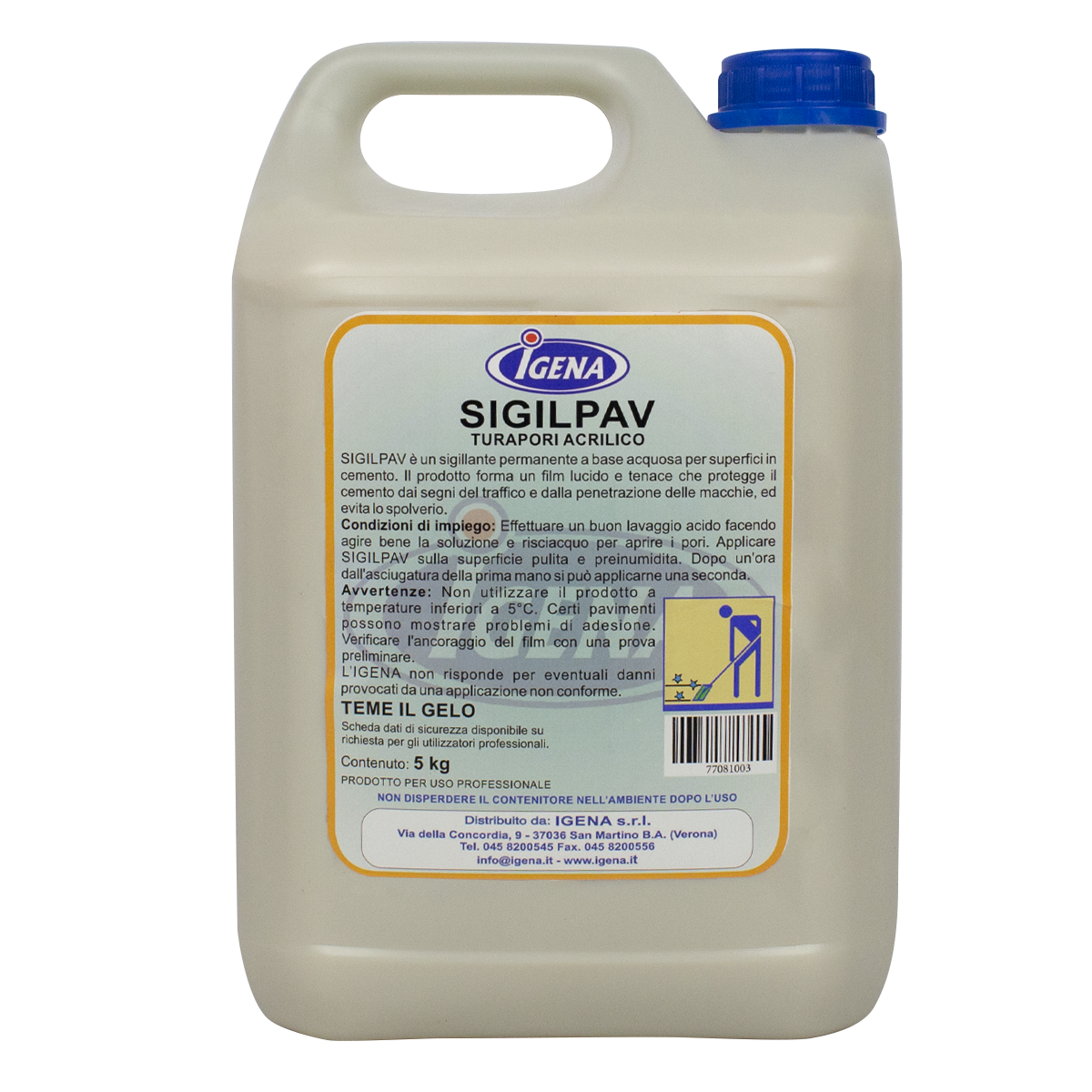 SIGILPAV è un sigillante permanente a base acquosa per superfici in cemento. Il prodotto forma un film lucido e tenace che protegge il cemento dai segni del traffico e dalla penetrazione delle macchie, ed evita lo spolverio.